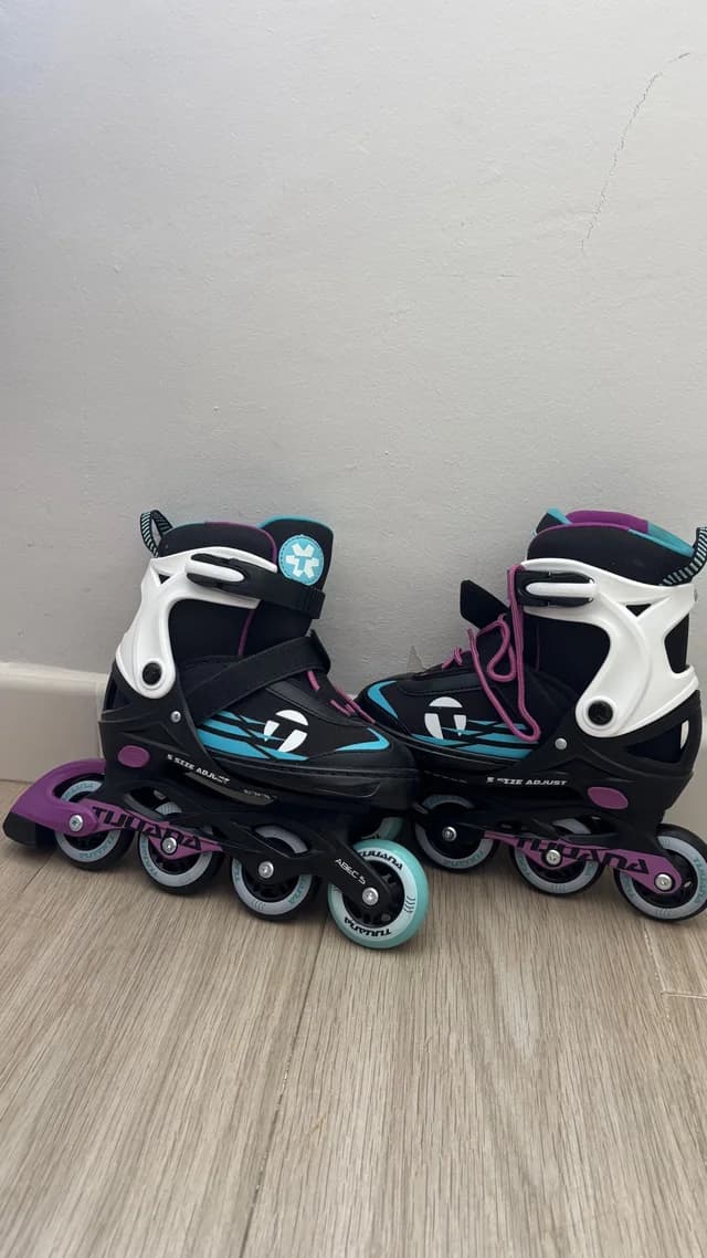 Patines en línea TUANA, ajustables a la talla. Ideales para principiantes. Son de color negro, blanco y morado, y se encuentran en buen estado. - Sistema de ajuste de talla. - Ruedas de color turquesa. - ABEC 5